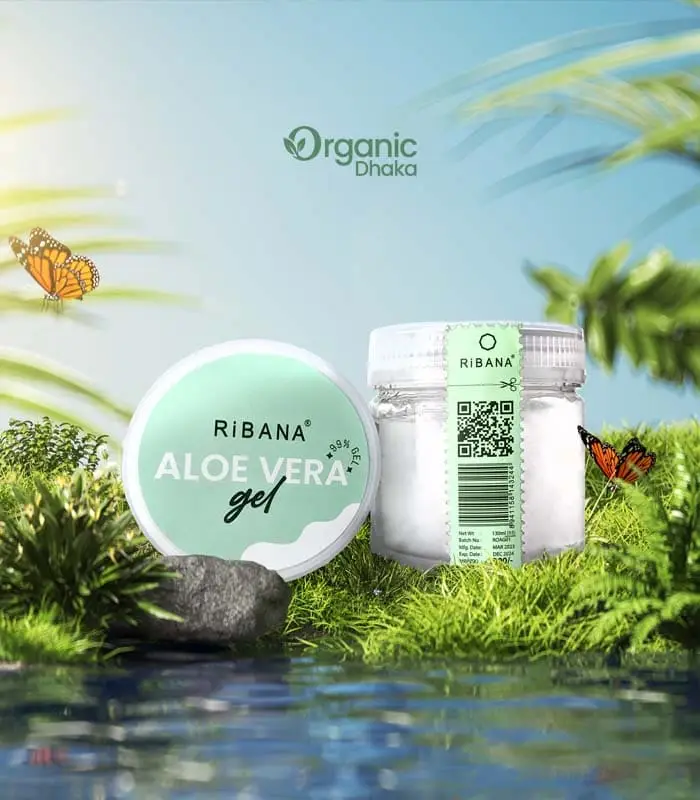 RiBANA Aloe Vera Gel is a 100% pure, paraben-free gel enriched with natural aloe vera and Vitamin B3. It helps soothe sunburn, moisturize skin, reduce acne, and lighten blemishes. Ideal for daily use as a moisturizer, soothing gel, or face pack medium.